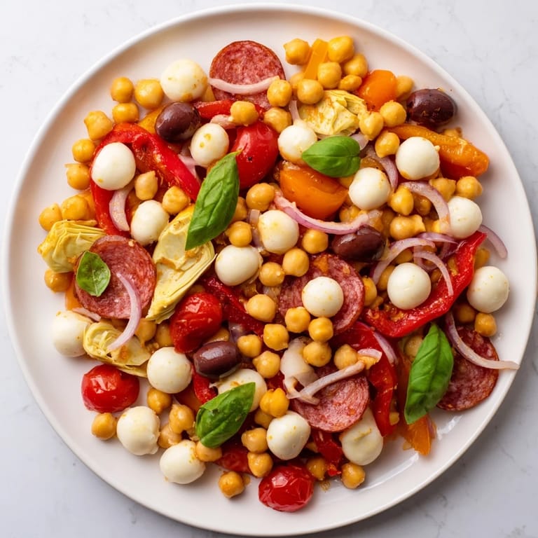 Save I threw this salad together on a Tuesday night when I had zero interest in turning on the stove. My fridge was cluttered with half-used jars of olives, a tub of mozzarella pearls, and a can of chickpeas I'd been meaning to use. What started as a lazy cleanup meal turned into something I actually craved the next day. The pepperoni adds this unexpected richness that makes it feel indulgent, even though it takes less effort than boiling pasta.