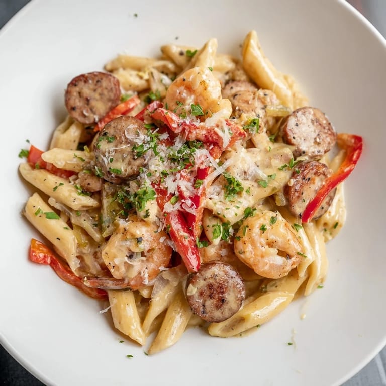 Save A creamy, spicy one-pan pasta featuring smoky sausage, succulent shrimp, and a rich Cajun Alfredo sauce—perfect for weeknight comfort.