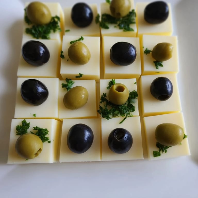 - Arrange the cheese cubes and olives alternately on a large square or rectangular platter to mimic a chessboard pattern (e.g., cheddar, black olive, mozzarella, green olive, etc.)