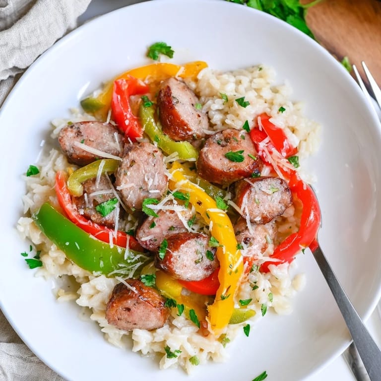 Save A hearty and flavorful dish featuring juicy Italian sausage, sautéed bell peppers, onions, and aromatic rice—perfect for a comforting weeknight meal.