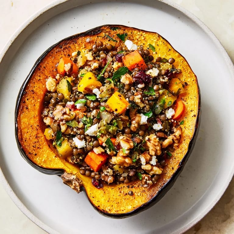 Save A hearty, flavorful dish featuring acorn squash halves filled with a savory mixture of lentils, walnuts, vegetables, and herbs. Perfect as a vegetarian main or festive side.