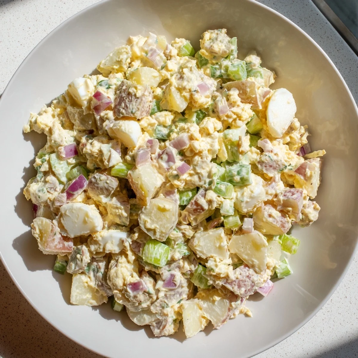 A creamy comforting salad combining tender potatoes chopped eggs and fresh herbs in a tangy dressing—perfect for picnics barbecues or as a hearty side dish.