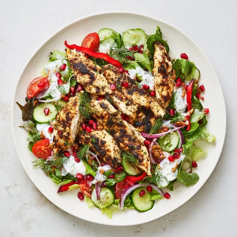 Save This salad brings a perfect harmony between spice, freshness, and creaminess. The black pepper and smoked paprika give the chicken a warm, inviting depth that complements the crisp greens and juicy bursts of pomegranate seeds. The yogurt dressing, laced with lemon and dill, ties all the components together for a festive touch that’s suitable year-round.