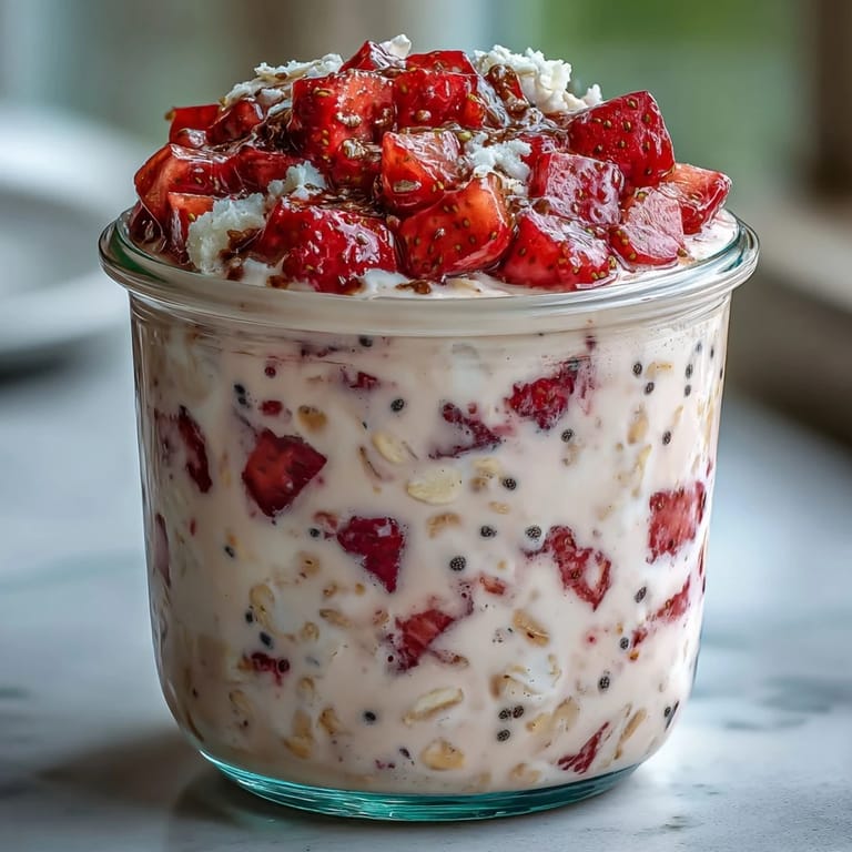 This chilled oat dish combines creamy oats soaked overnight with fresh strawberries, zesty lemon, and crunchy poppy seeds. The oats soften beautifully while absorbing the sweet and tangy flavors, creating a balanced and refreshing morning dish that's quick to prep and satisfying to enjoy. Perfect for a light, nutritious start to your day, it's easily customized with plant-based options and pairs well with herbal tea or fresh lemonade.